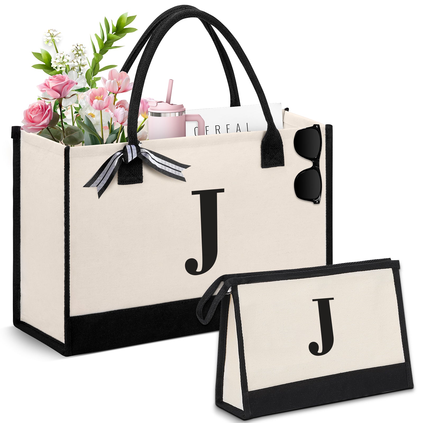 DAK06PITB0ZMJWH Personalized Initial Tote Bag, Large Capacity Canvas Beach Bag w/ Makeup Bag for Women, Valentine's Day Gifts & Birthday Gift Initial Tote Bag w/ Comfortable Handle for Wife Mom Teacher Friend