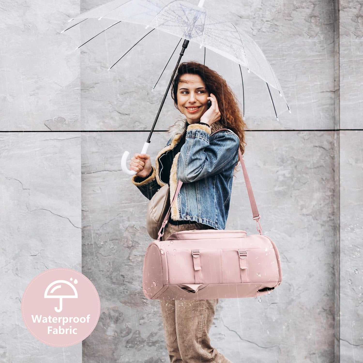 - Even in the rainy days, you do not have to worry about wetting this weekender overnight bag. This duffel bag's fabric is well performed in anti-wrinkle, even if the travel backpack is squeezed by other heavy items for one year, you will not find wrinkles when you use it again.