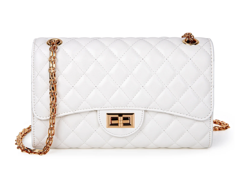 This trendy shoulder handbag features quilted exterior design with soft vegan leather, gold-tone hardware chain strap and secure anti-theft buckle closure.