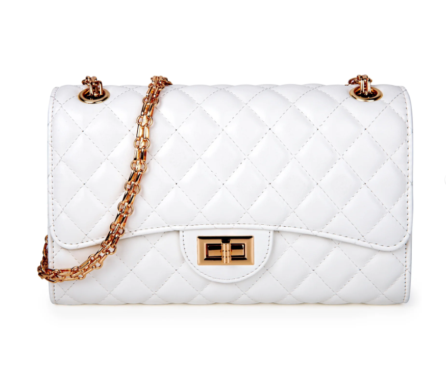 This trendy shoulder handbag features quilted exterior design with soft vegan leather, gold-tone hardware chain strap and secure anti-theft buckle closure.